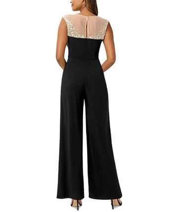 A skirt-style overlay falls from the waistline down one leg on this sleek jumpsuit from Adrianna Papell. Imitation pearls give the look a touch of glam.