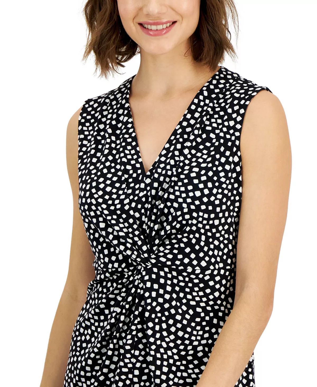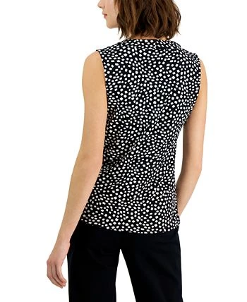 A stylish twist on a staple, this Alfani sleeveless top features a contemporary print and knot detail at the front.