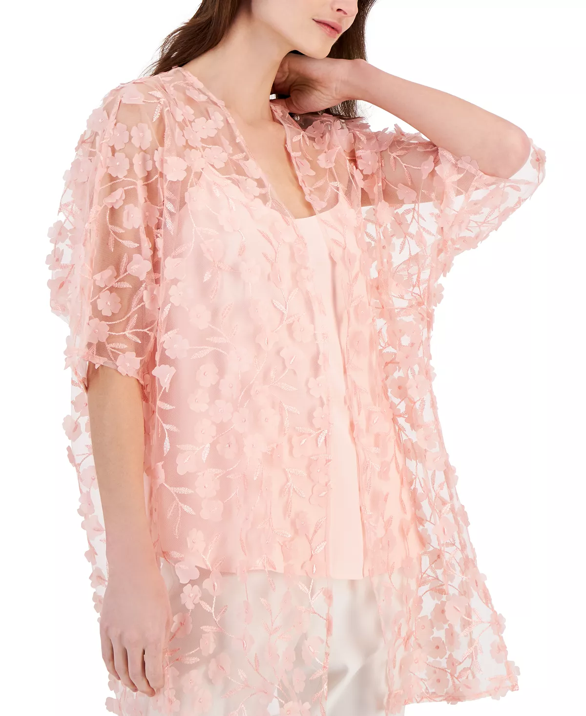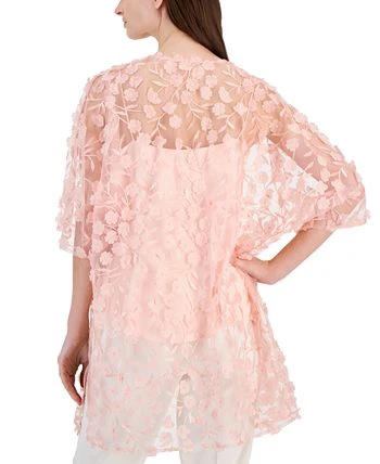 A sheer layer with something extra, this open-front topper from Anne Klein blooms with 3D floral appliqués that flutter as you move.