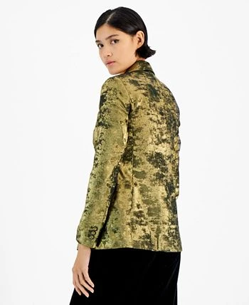 Rich shades of shimmer dramatically dress up the classic notched collar one-button shape of this metallic jacket from Bar III.