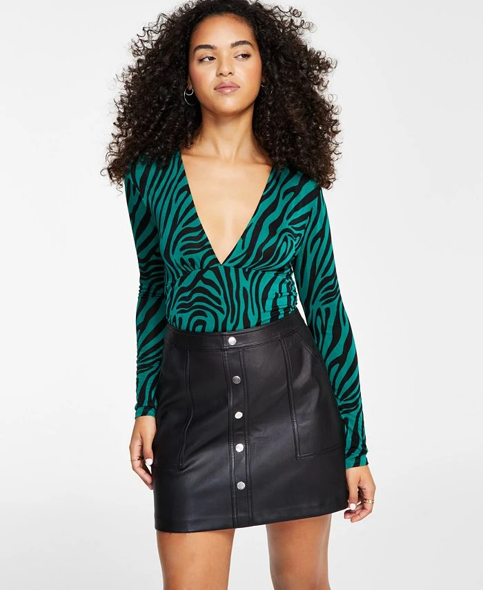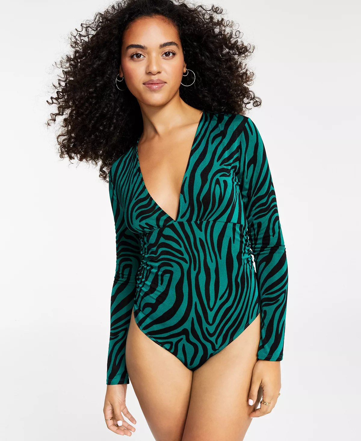 Get spotted in this chic bodysuit from Bar III designed with a deep V-neck and a gorgeous zebra print throughout.