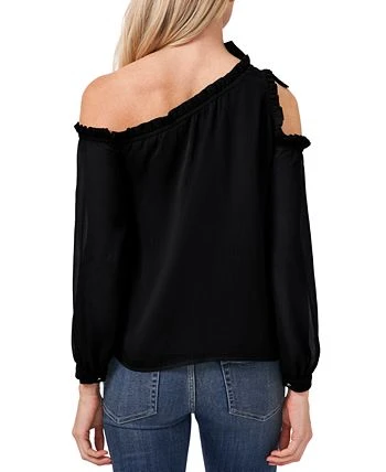 CeCe blends classic and modern with this sophisticated long-sleeve top, an asymmetric cold-shoulder design trimmed with sweet ruffles and a charming bow detail.