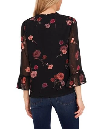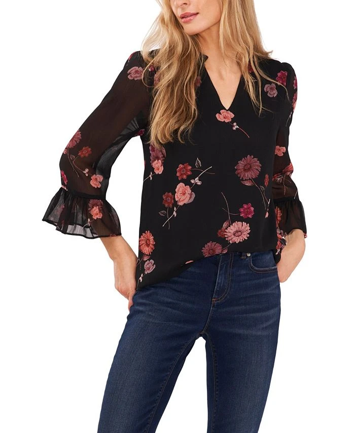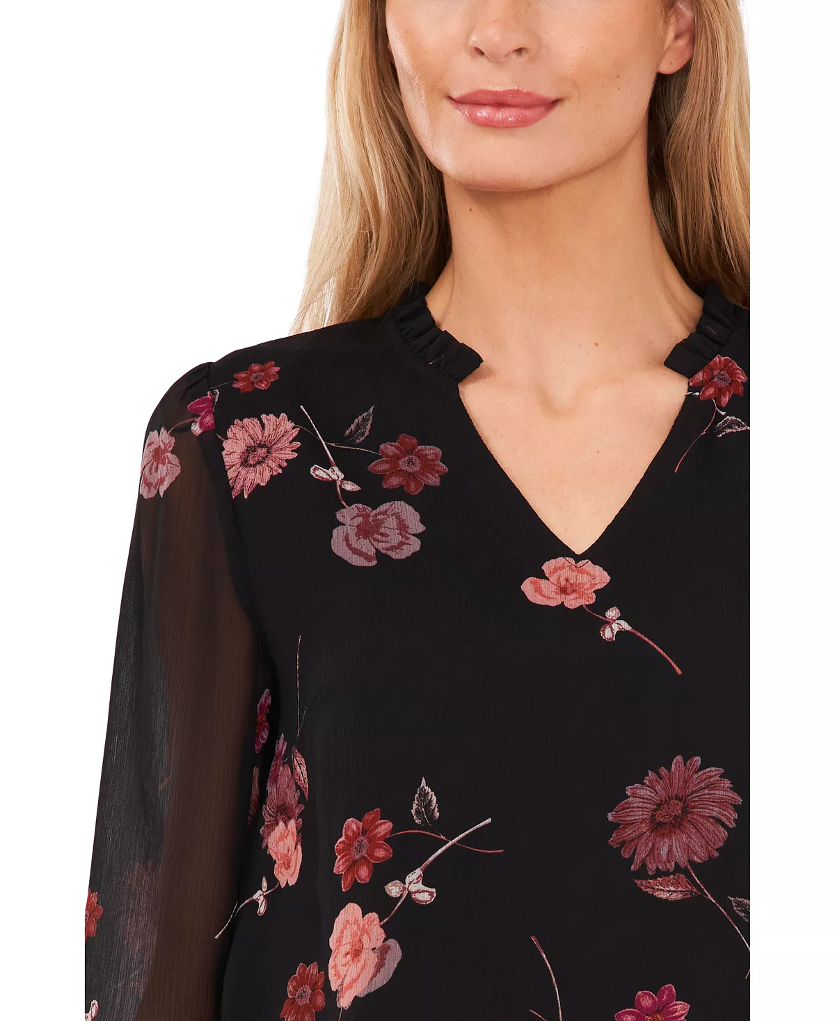 A beautiful romantic floral and ruffled details elevate this blouse from CeCe.