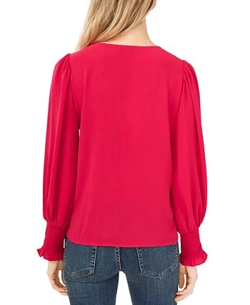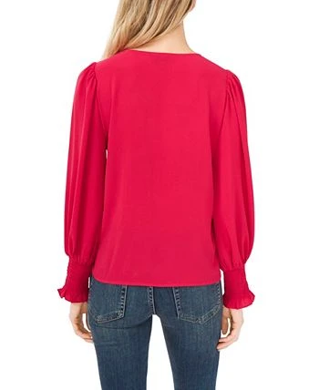 Dainty sheer sleeves with smocked cuffs frame this V-neck soft texture blouse from CeCe.