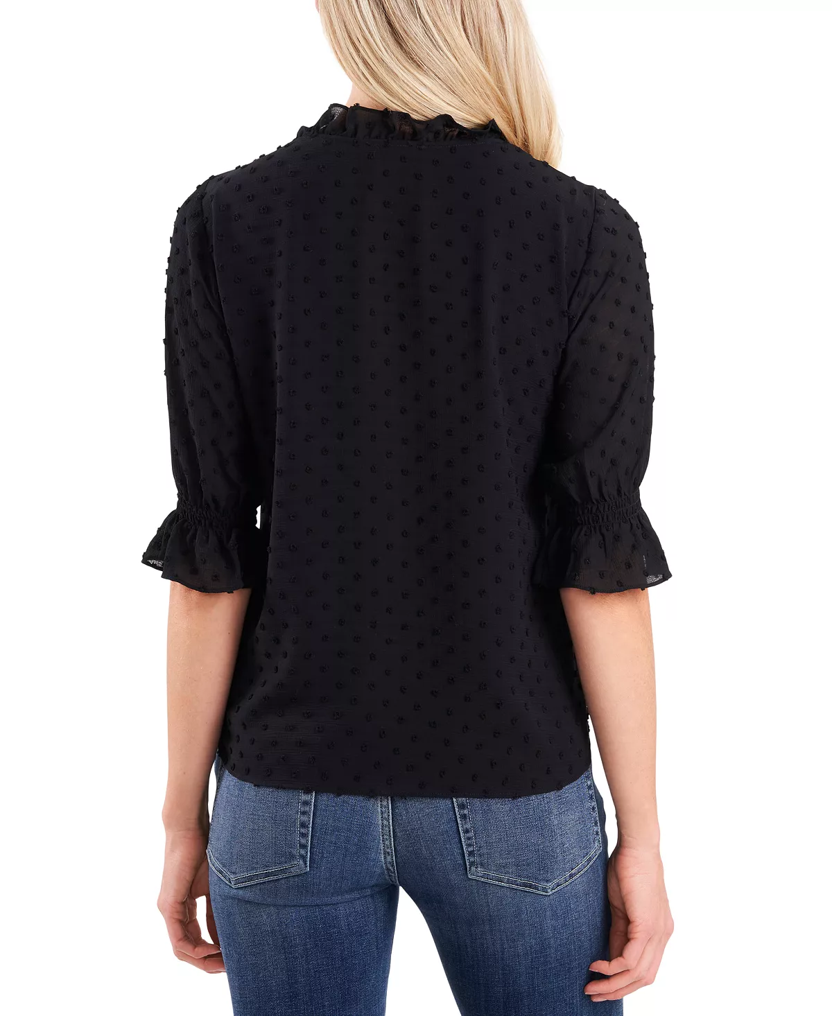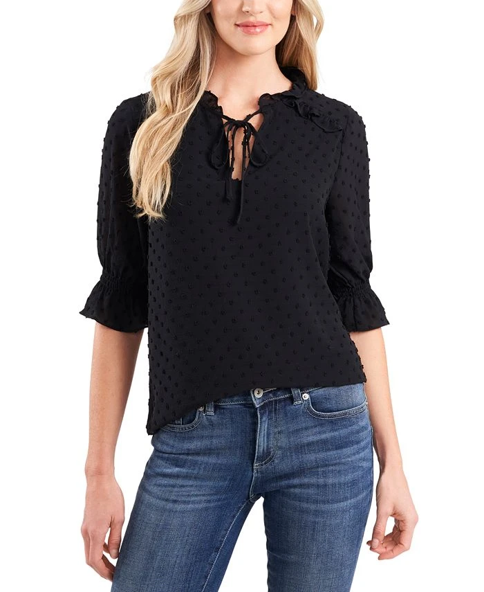 Subtle ruffles and a clip-dot design bring beautiful texture to a sophisticated silhouette with this tie-neck top from CeCe.