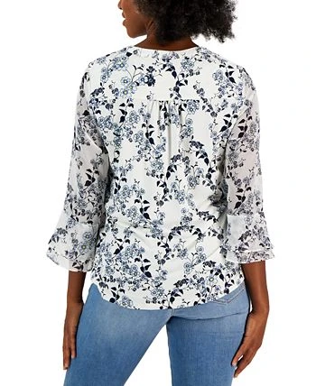 Soft tiers cap sheer bell sleeves, bringing this contemporary split-neckline top from Charter Club to a lovely finish.