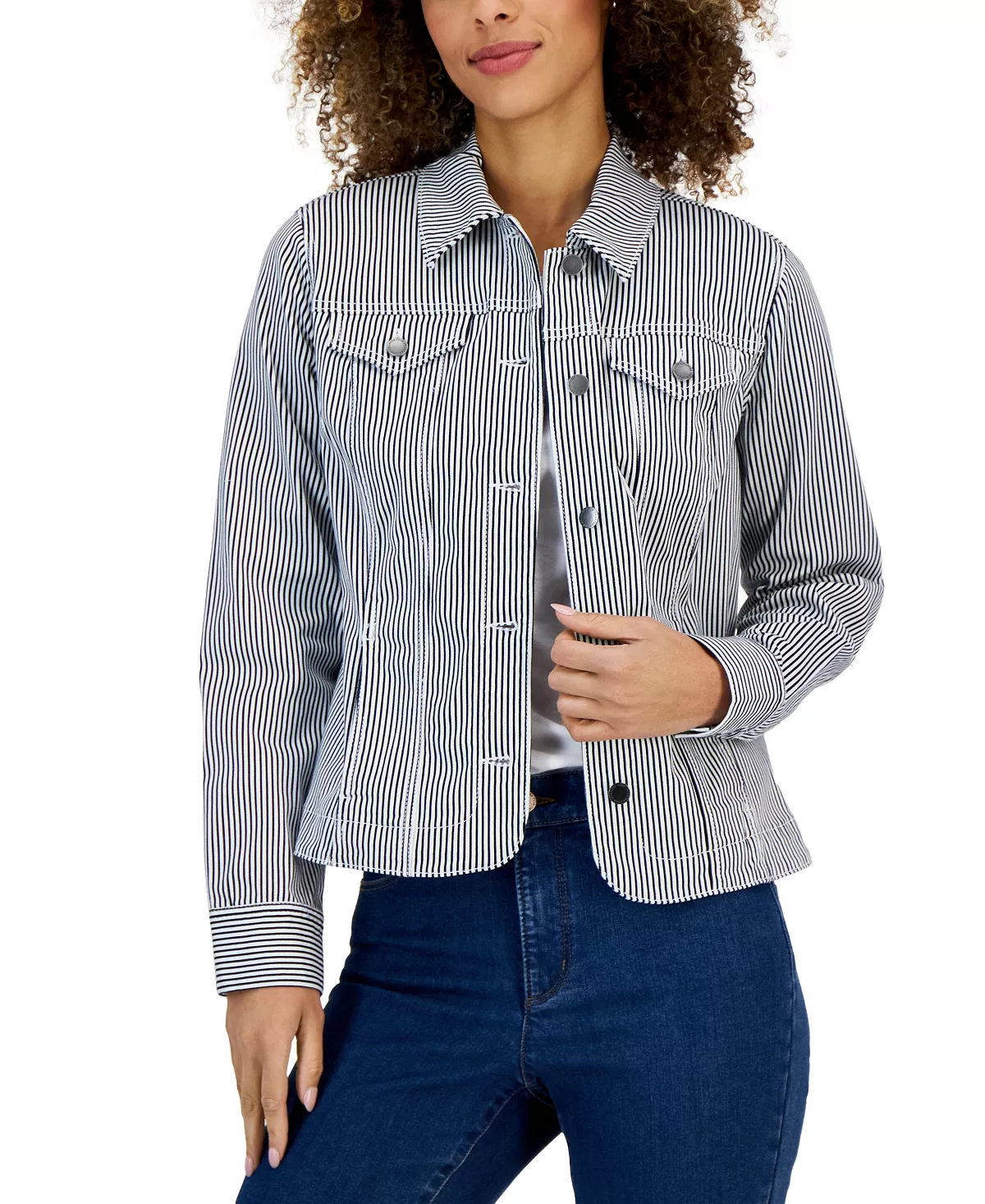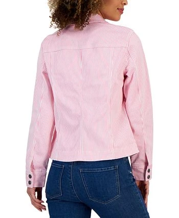Stylish seaming and candy-colored stripes elevate this look from Charter Club, a denim jacket with polished appeal.