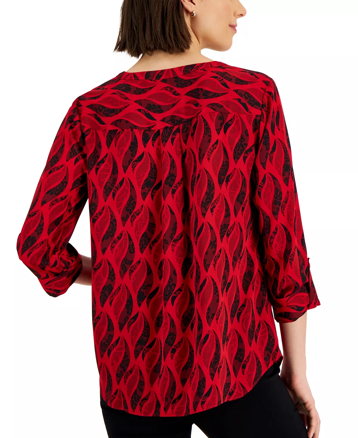 An eye-catching print and versatile roll-tab sleeves add unmistakable style to a classic silhouette in this top from JM Collection.