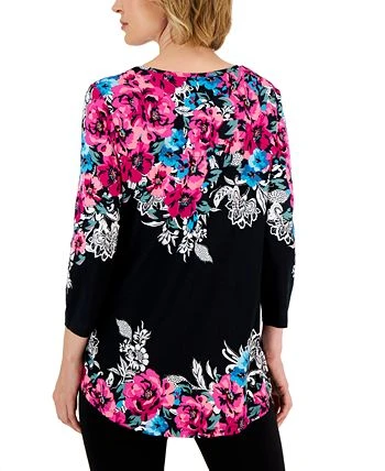 Vibrant florals drift into bold contrast tones, bringing a stunning new look to JM Collection’s relaxed knit top.