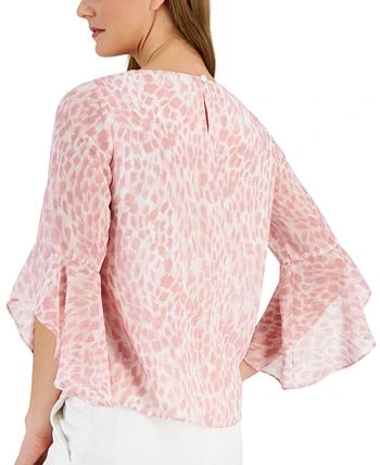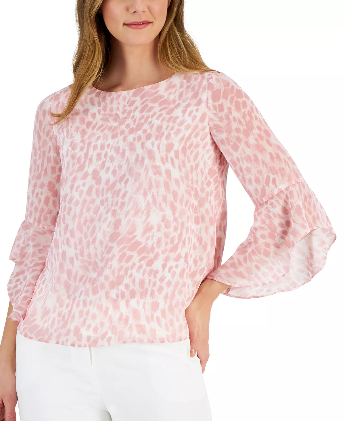Kasper mixes flowing bell 3/4-sleeves and a delicate allover print in this work-ready blouse.