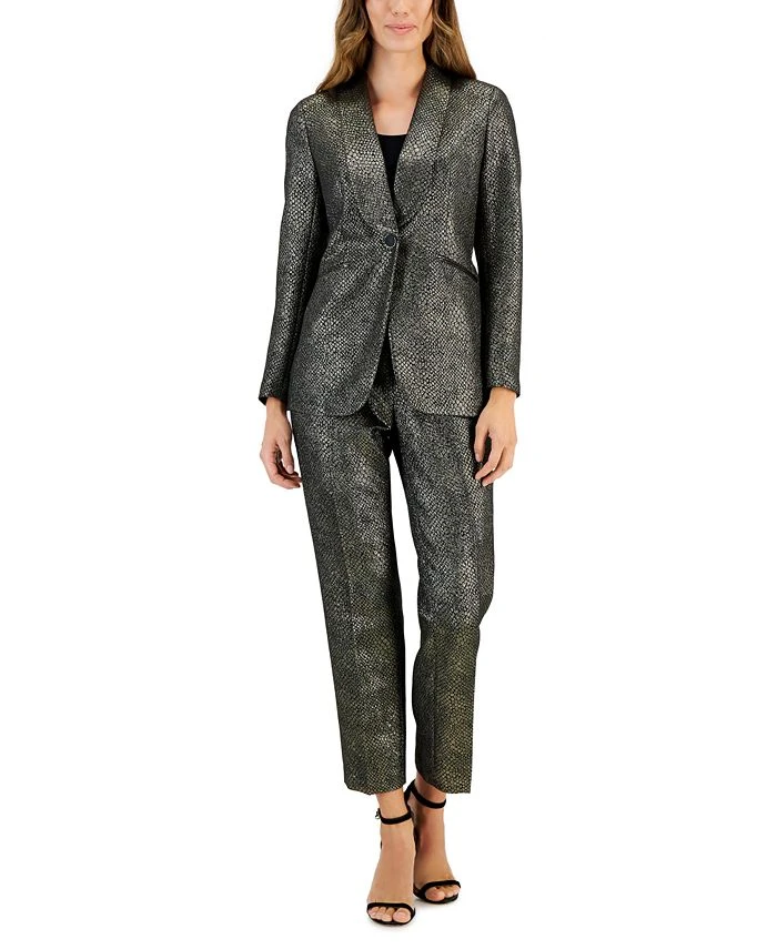 Professional polish in metallic jacquard, Kasper’s shawl-collar one-button jacket makes a stunning statement.