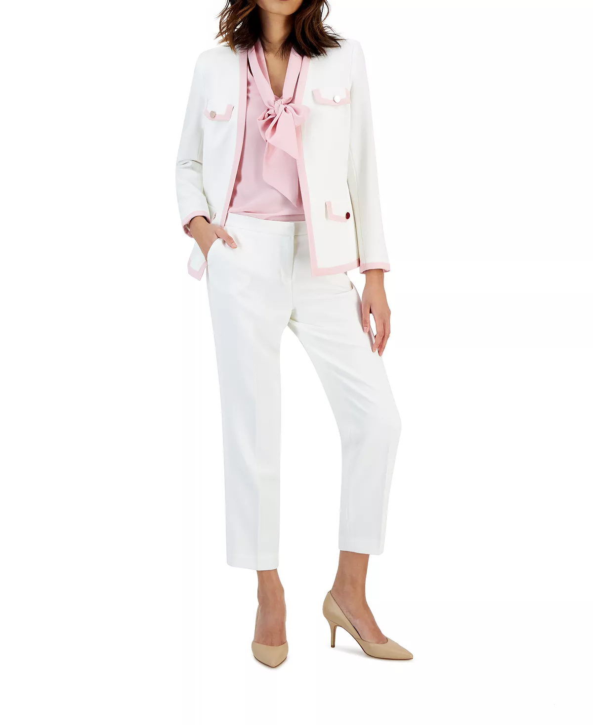 Top off your professional look with this ultra-chic framed open-front blazer from Kasper.
