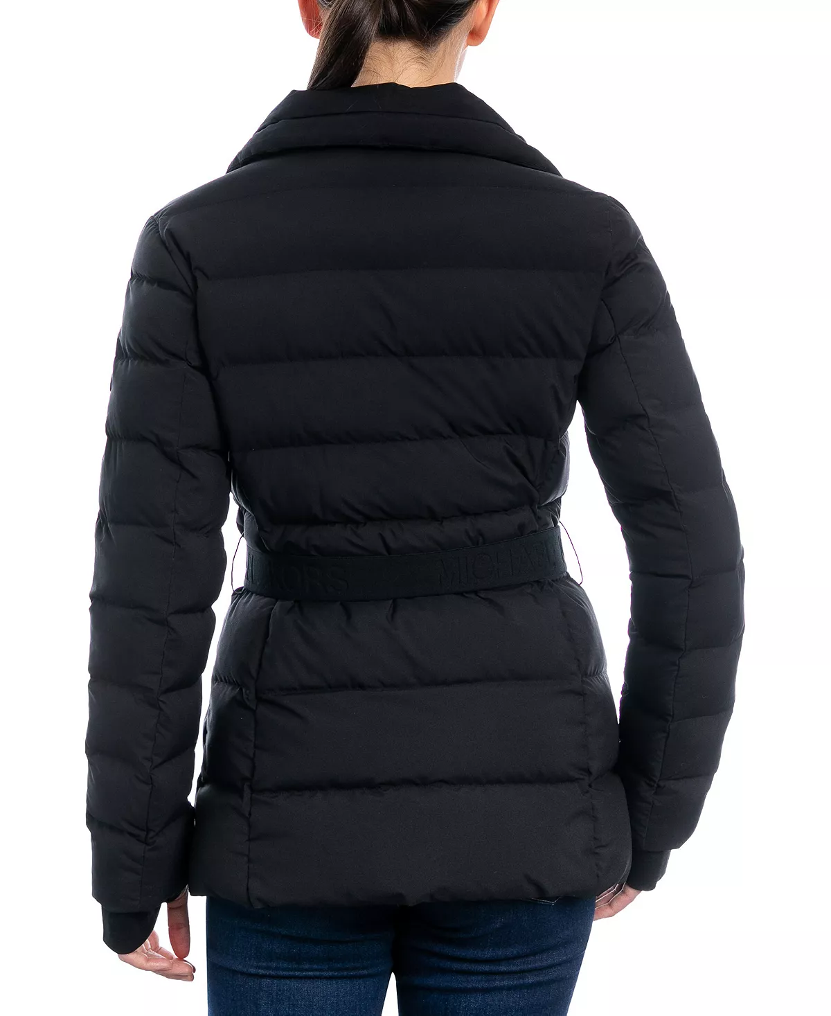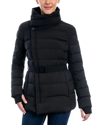 An asymmetric zip front lends a chic vibe to this belted down puffer coat from MICHAEL Michael Kors.