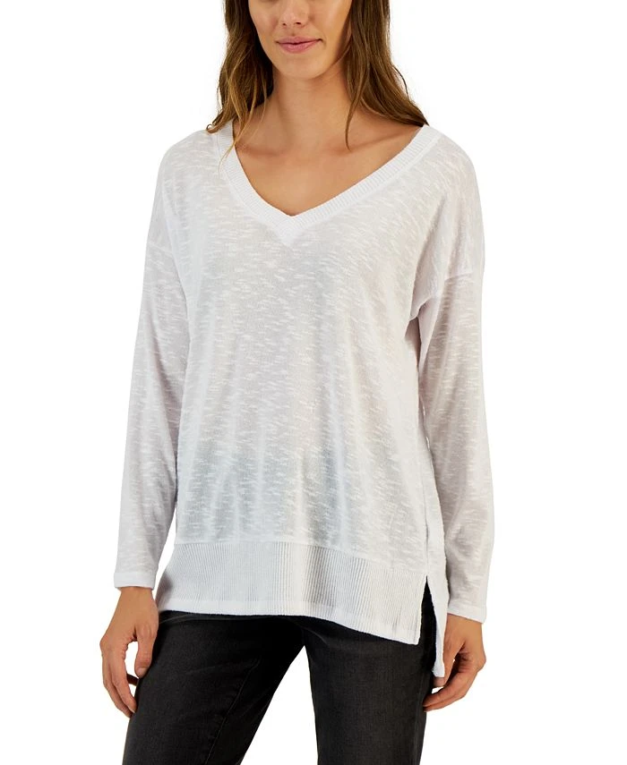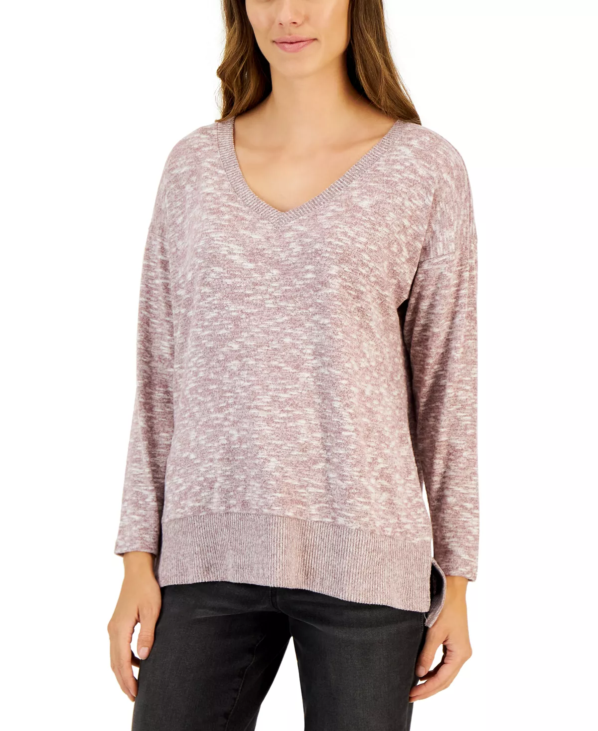 A deep V-neckline enhances the relaxed look of this comfy pullover snit top from Style & Co.