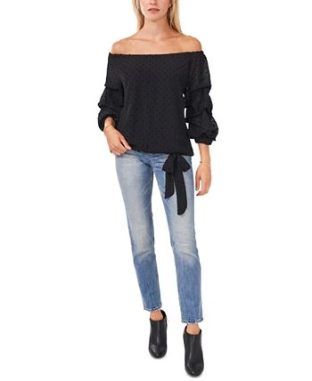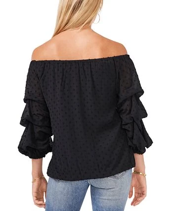 This stylish blouse from Vince Camuto combines a chic clip-dot texture with an elegant off-the-shoulder neckline and voluminous sleeves.