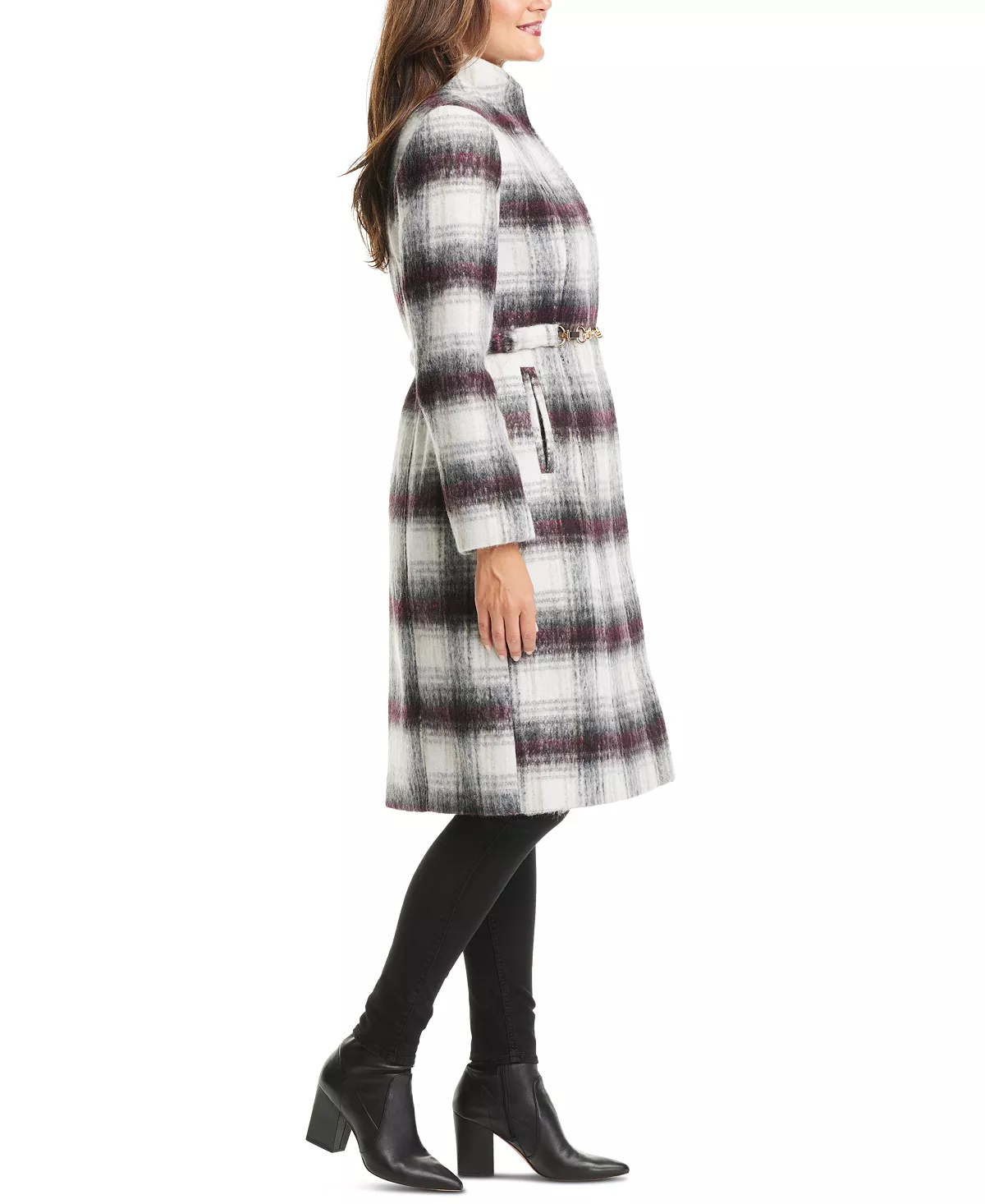 Vince Camuto’s gorgeous plaid coat features a shimmering gold-tone chain belt for a chic finish.