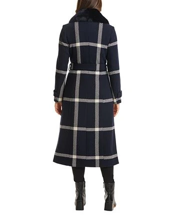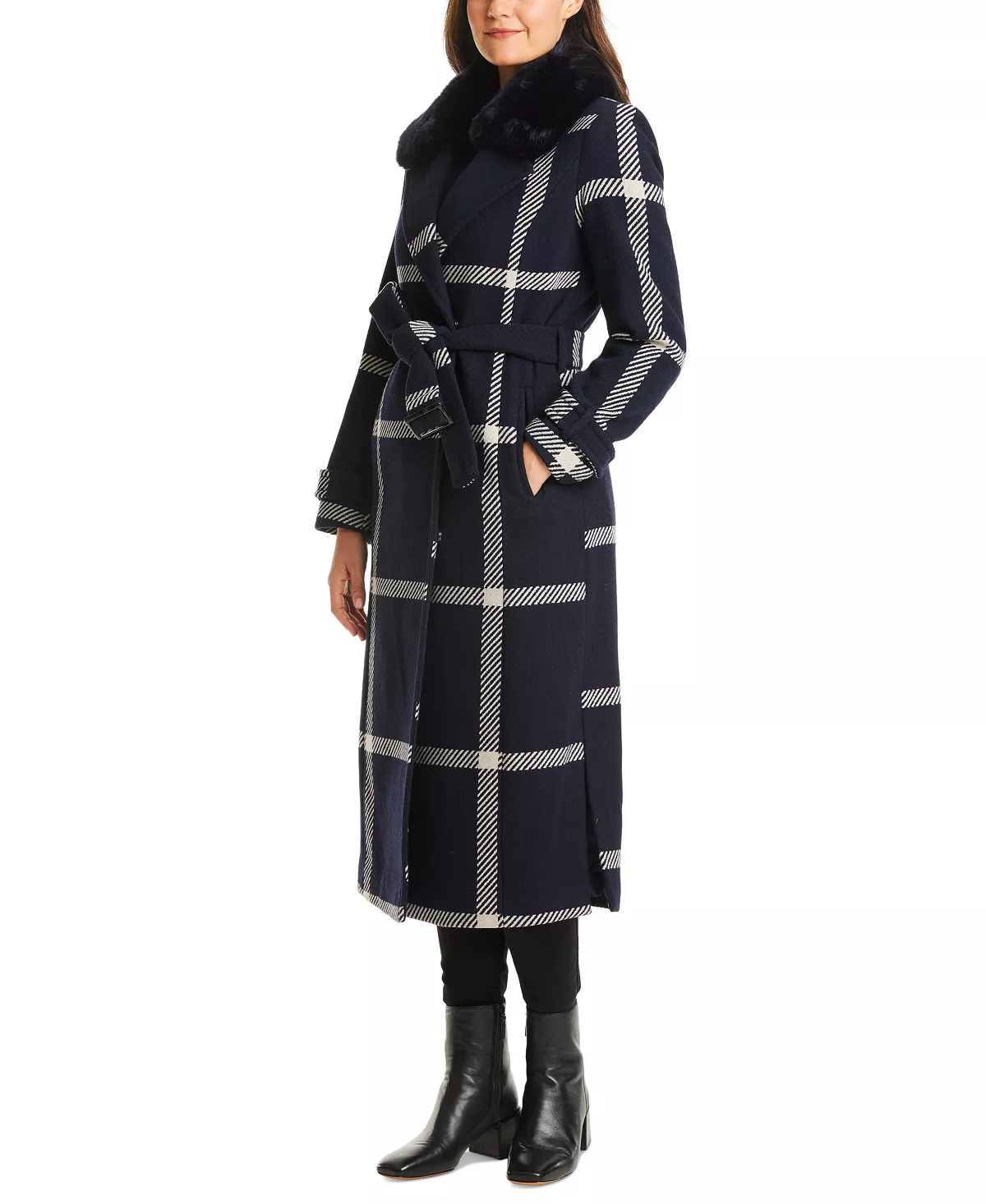 Elegance comes easy in this plaid wrap coat from Vince Camuto designed with a self-tie belt and stunning faux-fur trim.