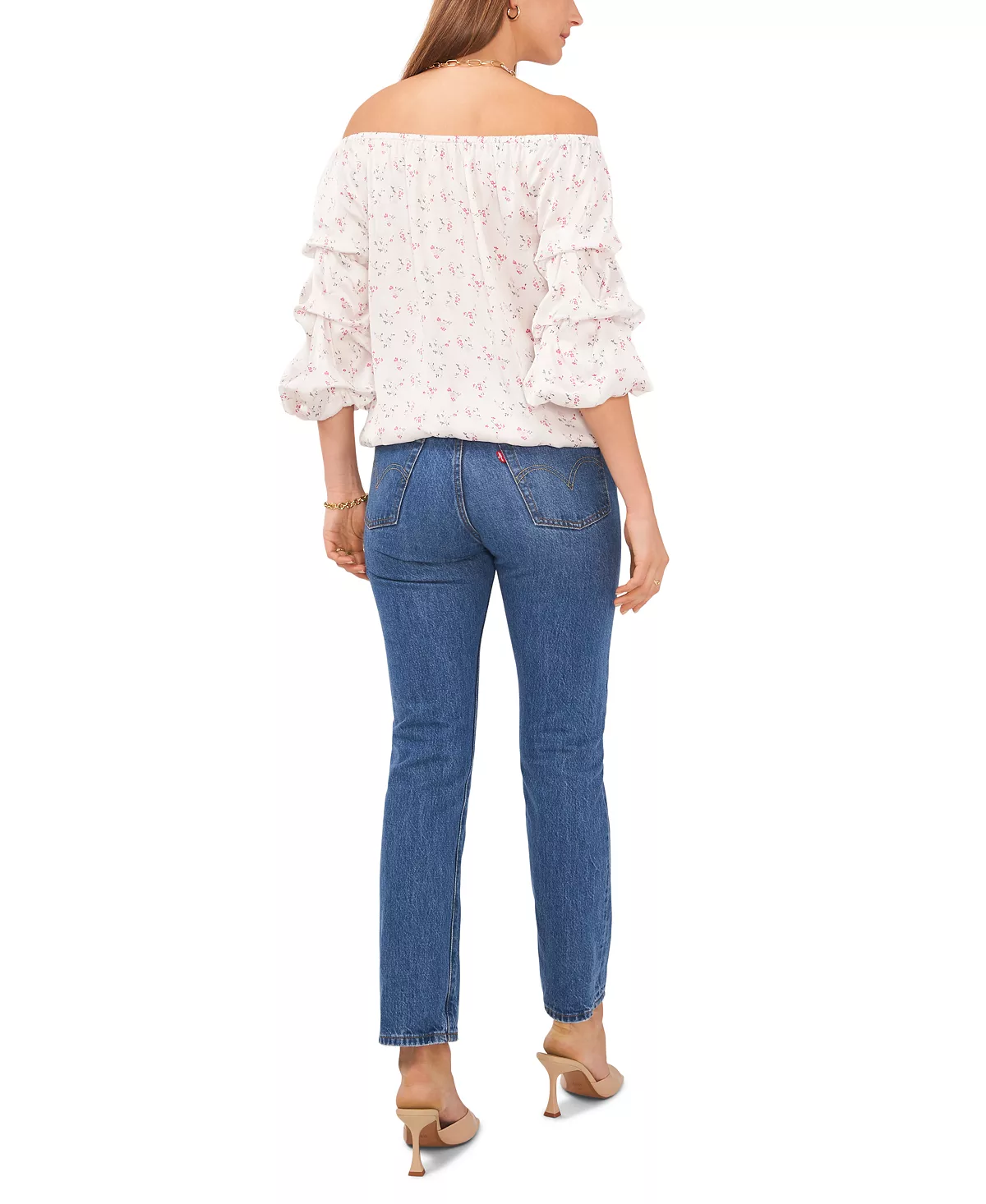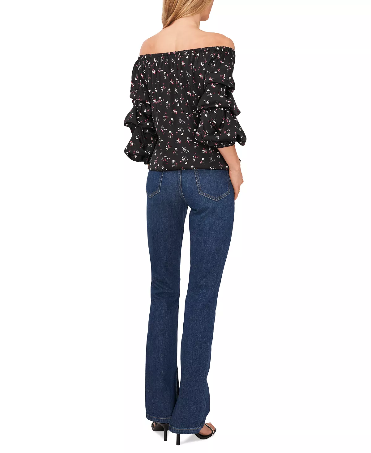 A sweet floral print brings vintage-inspired charm to this Vince Camuto top, an off-the-shoulder silhouette finished with bubble sleeves.