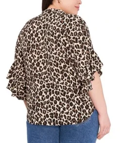 - Mock neck with ruffled trim; button closures at back neckline keyhole